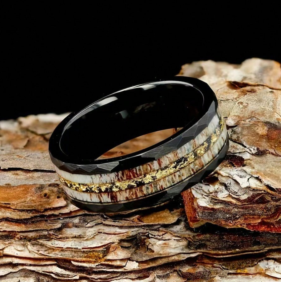 Men’s 8mm Black Tungsten Carbide Ring, Inlaid With Muonionalusta Meteorite Hammered Texture Wedding Band